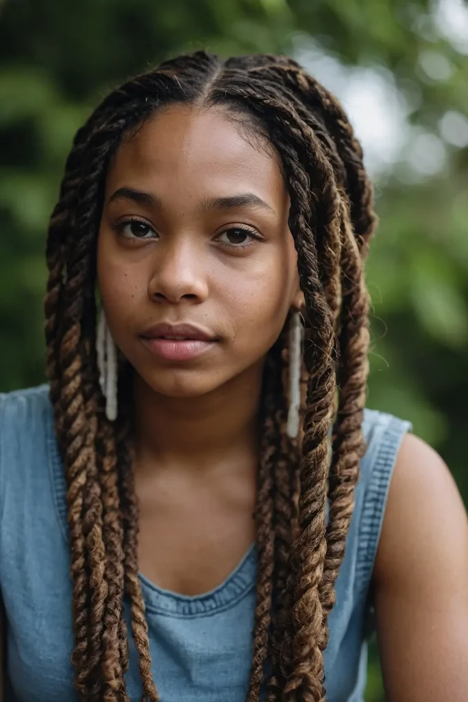Chunky twists offer lower maintenance since you’ll have fewer individual locs to manage. They also create impressive volume and presence.